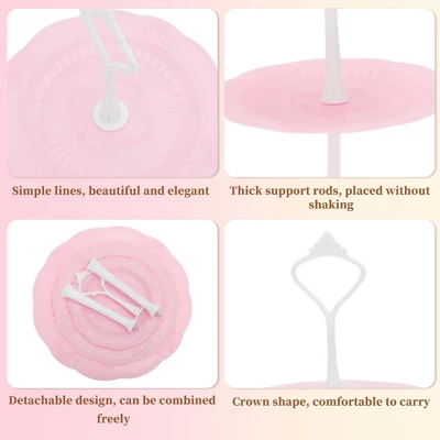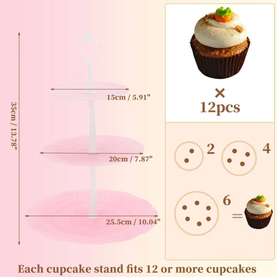 Feature:This cupcake stand holder is made from quality PP material, ensuring sturdiness and durability and having a long service time.This dessert cupcake stand makes it suitable for a wide range of occasions, including weddings, birthday parties, baby showers, and more. This cupcake stand holder is easy to assemble with no tools required, making it convenient to set up for your event. The adjustable tiers of this cupcake stand holder allow you to customize the display according to your needs. Featuring a space-saving design that allows you to save counter or table space while displaying a large number of cupcakes.Specification:Material: PP;Height: 35cm / 13.78″;Plate Size: 15cm / 5.91″, 20cm / 7.87″, 25.5cm / 10.04″;Package List:1 Set Cupcake Stand Holder.