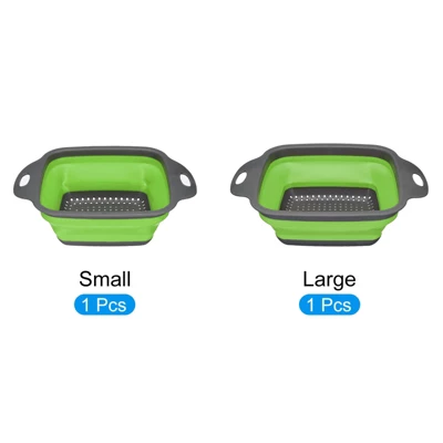Why Choose It?3 colors offer to you, different colored colanders can be used for different foods to decorate your colorful kitchen.With evenly drainage holes at the bottom, draining water is fast and the effect is good, easy to use.Well designed side handles are easy to hold, also can be hung on the wall when not in use.The foldable design can be adjusted according to your different needs for easy storage.Heat resistant up to 230°F which makes it easier to strain hot stuff as well.Specification:Product Name: Square Silicone Collapsible Colander SetMaterial: siliconeColor: greenFold Size: large: 29cm x 22cm x 3cm/11.4 x 8.66 x 1.2inch small: 24cm x 18.4cm x 3cm/9.44 x 7.24 x 1.2inchExpand Size: large: 29cm x 22cm x 9cm/9.4 x 8.66 x 3.54inch small: 24cm x 18.4cm x 7.5cm/9.44 x 7.24 x 2.95inchWeight: 235gPackage Content: 2 x collapsible colander (1 small 1 large)Suitable for: drain, wash vegetable, fruit and pasta