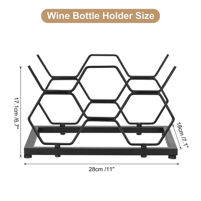 This tabletop wine rack is crafted from durable iron materials with a powder coating finish, ensuring long-lasting use. Its geometric design adds a modern touch to any home style, while the horizontal storage keeps corks moist and prevents air leakage. The rack holds up to 5 standard wine bottles and features a non-slip base for stability. Ideal for kitchens, dining rooms, or bars, it saves countertop space and doubles as a glass holder. Perfect as a gift for wine lovers, it requires no complex assembly and is ready to use out of the box.