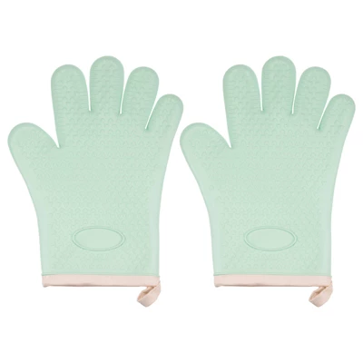 These light green silicone oven mitts offer high-temperature protection with their heat-resistant silicone material and insulating cotton lining. Designed with a dimpled, textured surface, they provide a secure grip on pots and pans, preventing slips when handling hot dishes. They are easy to clean and dishwasher safe, featuring convenient hanging holes for easy storage. Suitable for various hot surfaces, including ovens and microwaves, they ensure safe handling of hot items, minimizing the risk of burns.