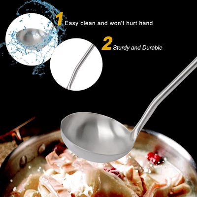 This durable soup ladle is perfect for use in restaurants, food shops, catering halls, and home kitchens. Ideal for cooking porridge, soup, noodles, and hotpot. The ladle’s solid construction is gentle against delicate pots and nonstick pans, allowing you to firmly scrape up any food from the bottom without scratching the surface. Its stainless steel design ensures it will never go out of style, making it a great addition to any kitchen. Suitable for chefs in canteens, dining halls, and messes, this ladle provides a safe and comfortable experience, especially when dealing with hot soup or water. Dishwasher-safe and easy to clean, this ladle is both odor and stain-resistant. Total size: 36 x 9cm (14.2″ x 3.5″), head size: 9 x 9cm (3.5″ x 3.5″). Package includes 1 soup ladle.