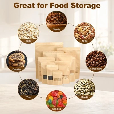These kraft paper bags are a great tool to store kitchen ingredients, food, and daily necessities. Widely used for storing beans, tea, herbs, spices, coffee, snacks, nuts, dried fruit, cookies, seasonings, confections, candy, chocolate, and powders. It is also a perfect choice for sample display or item packaging. This bag is made of reusable kraft paper that is thick, durable, and not easy to tear or wear. Wax coating covered inside and outside can make the bag tougher and effectively improve moisture and dust resistance. Zip closure is easy to use and ensures tight sealing that can effectively prevent leaks, dust, and moisture to extend the shelf life of the items. The glossy front window design can display items inside. Self-standing thickened bottom enhances the bag’s weighing capacity. The U-shaped notch is designed for easy opening. Easy to use, just open the bag and put the items that need to be sealed into it. Please check the size before purchasing.