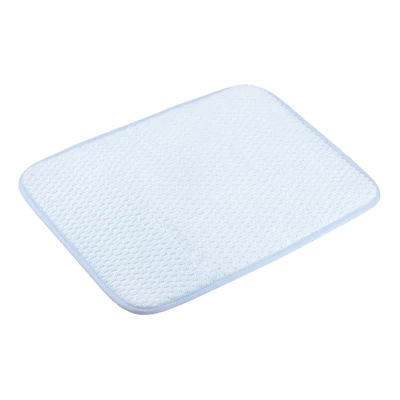 The dish drying mat is crafted from absorbent microfiber, ensuring no fading or odors while keeping countertops dry. Its foldable design allows for easy storage in drawers or cabinets without occupying much space. The mat’s water absorption feature helps maintain a tidy kitchen counter and safeguards the tabletop and glassware. It serves multiple functions, such as draining water, acting as a heat insulation pad, or even being used as a pet mat, provided it is cleaned and dried post-use. The mat is easy to care for, with hand wash instructions available. Measuring approximately 15.75 x 11.82 inches, it comes in blue, is suitable for various kitchen uses, and includes two pieces in the package.