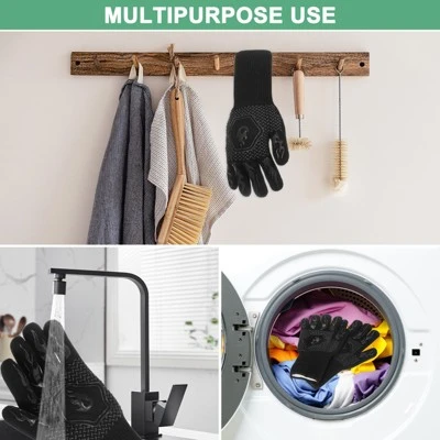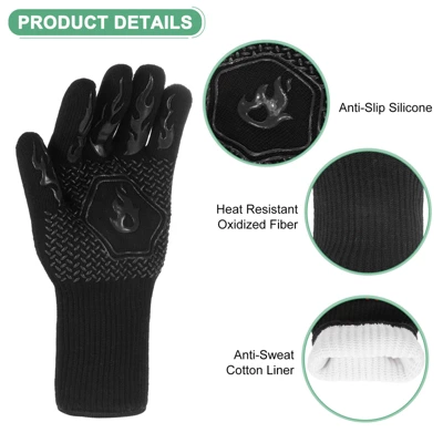 These versatile grilling gloves are designed to withstand high temperatures, making them ideal for kitchen use, barbecue parties, and more. The gloves feature a three-layer construction, including a silicone strip for a non-slip grip, high-strength oxidized fiber for heat resistance, and a comfortable polyester cotton interior. The flexible five-finger design allows for easy handling of cooking tools and hot objects without fear of dropping them. With their stylish appearance, these gloves are also stain-resistant and easy to clean. However, it’s important to avoid direct contact with open flames or prolonged exposure to high temperatures to prevent burns.