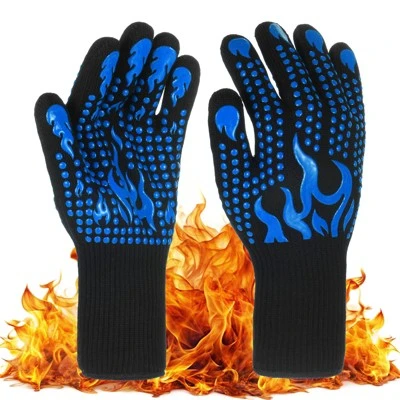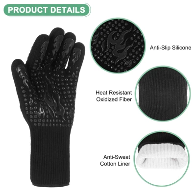 These versatile grilling gloves are designed to withstand high temperatures, making them ideal for kitchen use, barbecue parties, and more. The gloves feature a three-layer construction, including a silicone strip for a non-slip grip, high-strength oxidized fiber for heat resistance, and a comfortable polyester cotton interior. The flexible five-finger design allows for easy handling of cooking tools and hot objects without fear of dropping them. With their stylish appearance, these gloves are also stain-resistant and easy to clean. However, it’s important to avoid direct contact with open flames or prolonged exposure to high temperatures to prevent burns.