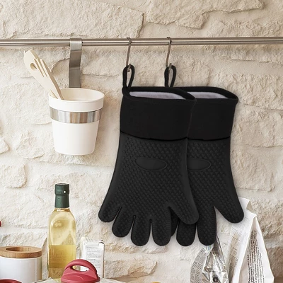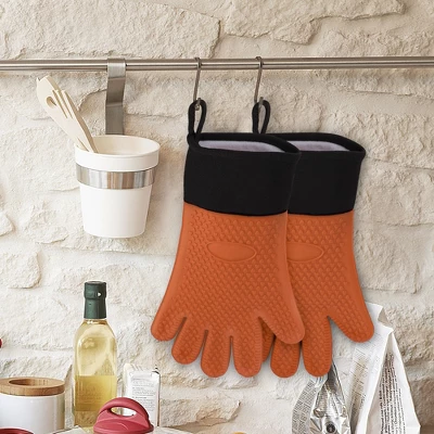 1. The exterior of the gloves is made of silicone, with excellent waterproof and heat resistance up to 480°F. The quilted lining is comfortable and anti-scald. 2. The palm-connected hand shape design is based on ergonomics to make wearing easier and more comfortable. The textured surface has a good anti-slip effect, providing better control and stability. 3. The gloves are left and right-handed and used at will. It is applied to using in cooking, baking, and grilling. 4. The canvas hanging ring allows you to hang your gloves in the kitchen or outdoor preparation area for convenient use. 5. Total Size: 34.5 x 14 x 19cm/13.6″ x 5.5″ x 7.5″(L*Wrist W*Palm W); Package Include: 1 Pair Oven Mitts.