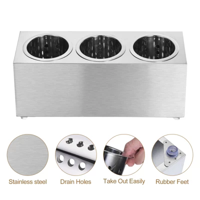 The commercial utensil holder is made of 201 stainless steel, corrosion-resistant, rust-resistant, and wear-resistant, ensuring long service life. There are full of drain holes at the bottom of the utensil holder, which drain excess water into the bottom and keep the utensils dry. The rolled edges on each hole allow you to easily take the slots out of the organizer, and the rolled edges do not hurt your hands. This commercial flatware organizer has 3 removable cylinder holders, which can be individually removed to throw in the dishwasher. The rubber feet prevent it from rolling, slipping, or tipping over. Utensil holders are suitable for storing spoons, forks, chopsticks, silverware, or other small items. Used widely in kitchens, restaurants, buffets, catering, cruise, and service areas.