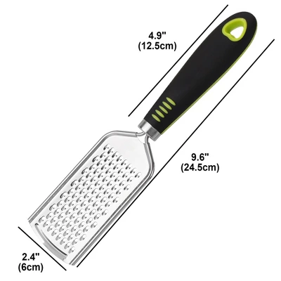 grater is made of 430 stainless steel, durable and rust-proof.The kitchen grater has a and sturdy blade that makes y cooking process very simple and efficient. The cheese zester design with a non-slip handle, and a saving-space hanger hole for easy storage. This cheese grater is grater for shredding chocolate, garlic, ginger, and so on. Easy to clean, dishwasher safe and if necessary, clean hard-to-wash residues by using a brush.
